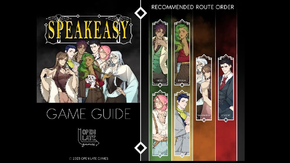 Navigate the world of Speakeasy, a visual novel available on itch.io, Steam, and JAST, with the Speakeasy Game Guide. With this 7-page PDF, follow along the recommended route order and collect all scenes, endings, and CGs to experience the full game as intended.